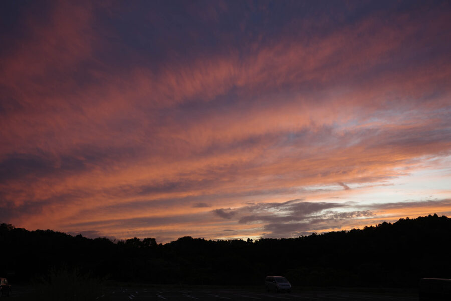 完全に日が落ちるまでの短い時間。シャッターチャンスはあまり長くないからこそ、儚く美しい景色を見せてくれます。クルックフィールズが位置する矢那は、周辺に景色を遮るものが少なく地域の中でも比較的標高が高いエリアなので、景色を楽しむにはとても良いスポットなのではないかと思います。