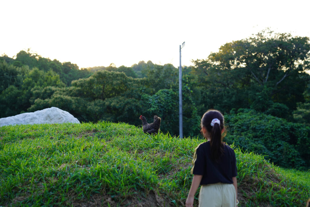 今回は1羽の鶏をはなし、その鶏を見守りながら、ゆっくり流れる時間を体験しました。