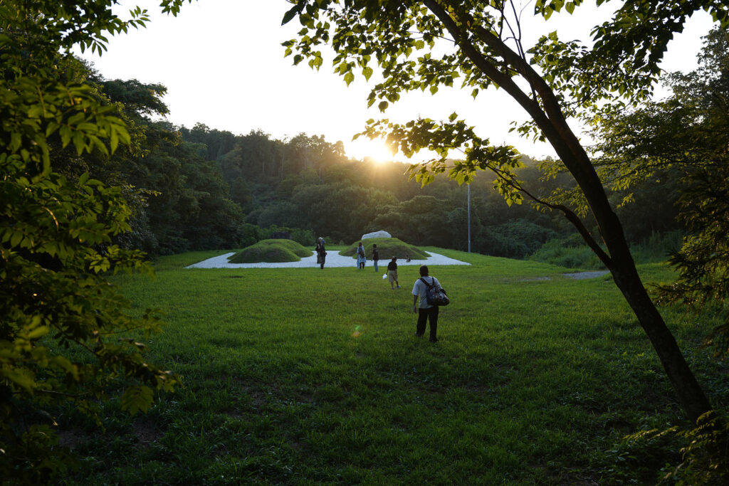 日が沈むころ開催されたのは「夕暮れのトリエステ」。島袋道浩さんのアート作品《ツチオとツチコ:55年後のBED PEACE》の草を鶏が突く様子から「エステみたいだね」となりこの名がついた体験。