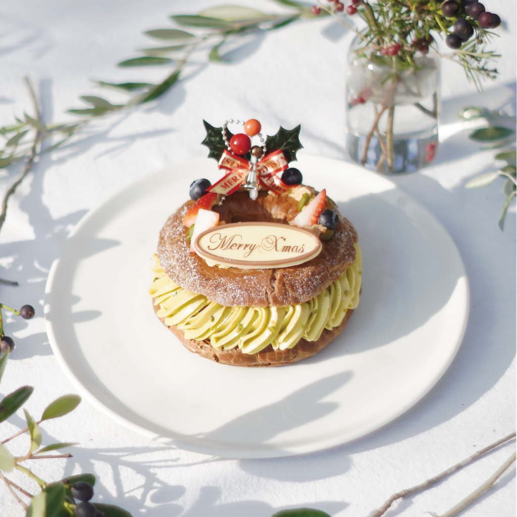 サクサクとしたココアのシュー生地にチョコレートのカスタードクリームとピスタチオクリームを絞ったクリスマスリースのようなケーキ。