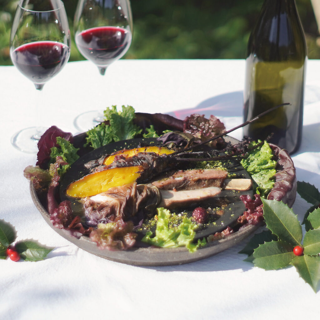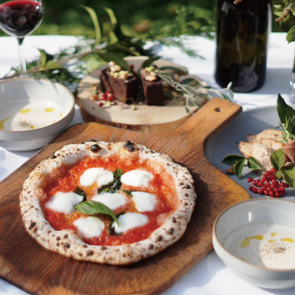 ディナーコースのシグネチャーディッシュ「水牛モッツァレッラのカプレーゼ」、打ちたてパスタ、薪火料理をはじめ、農場の食材をふんだんに使用した料理や内房総のミネラル豊富な海から直送された鮮魚を使ったクリスマス限定ランチシグネチャーフルコース。