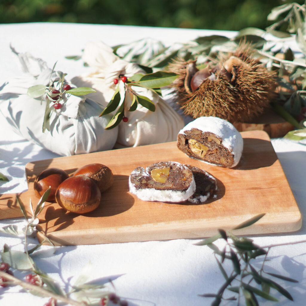 矢那の大粒の栗を一粒一粒手作業で丁寧に剥き、しっとりやさしい甘さに仕上げた渋皮煮をまるごと贅沢に包み込んだシュトレン。