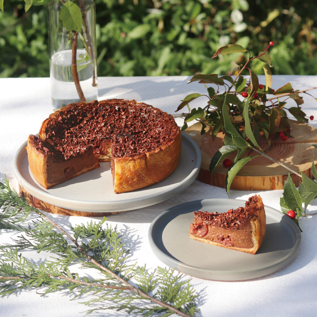 フランスの定番菓子”フラン”にビターなチョコレートとキルシュを効かせ、甘酸っぱいグリオットを忍ばせたほろ苦くリッチなスイーツ。もっちりとした弾力感、それでいて滑らかな口当たりをお楽しみください。